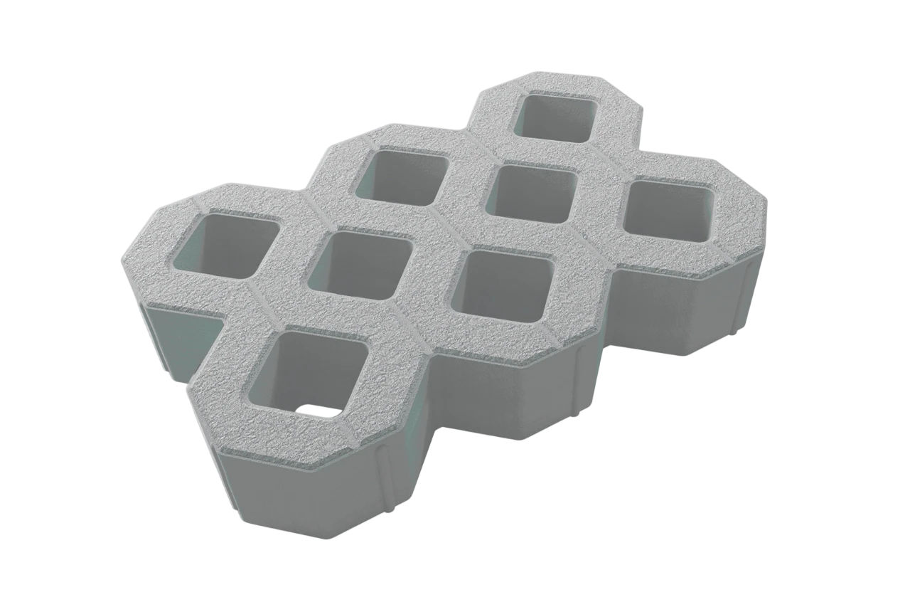 Газонная решетка представляет собой бетонное ячеистое изделие, которое используется в качестве покрытия парковок для различных типов транспорта, удержание земли на склонах и т.п.
