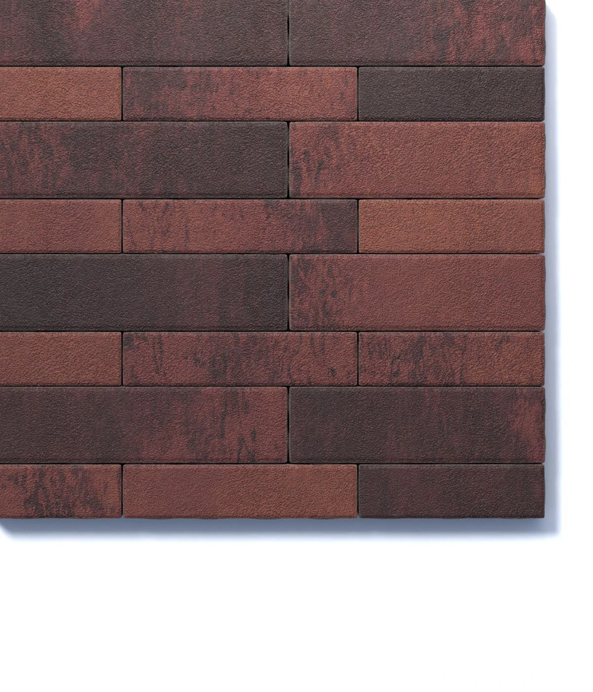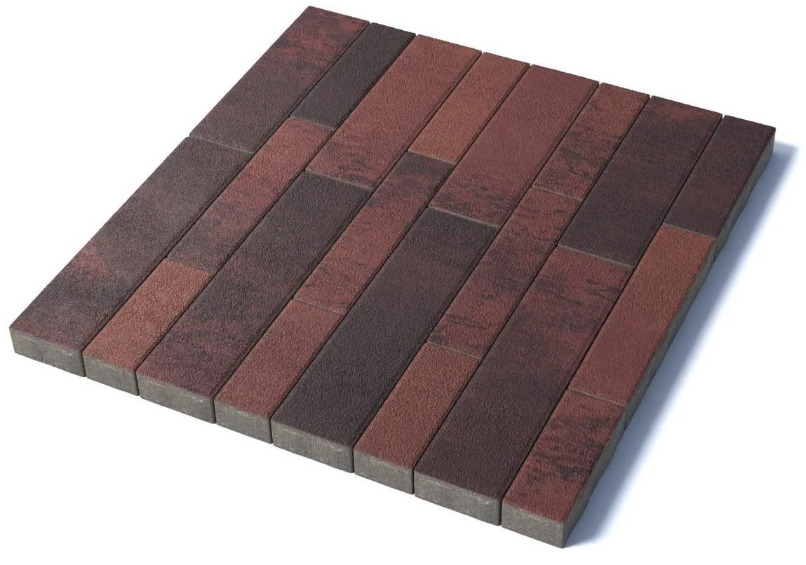 Состоит из 5-и элементов, которые выкладываются в хаотичном порядке рядами. Изготавливается по уникальной технологии методом полусухого вибропрессования из бетона. Поверхность выполнена с оригинальной зернистой фактурой красно-черного цвета. Натуральная гранитная крошка в лицевом слое изделий наделяет плитку приятной шероховатостью, а также устойчивостью к скольжению.