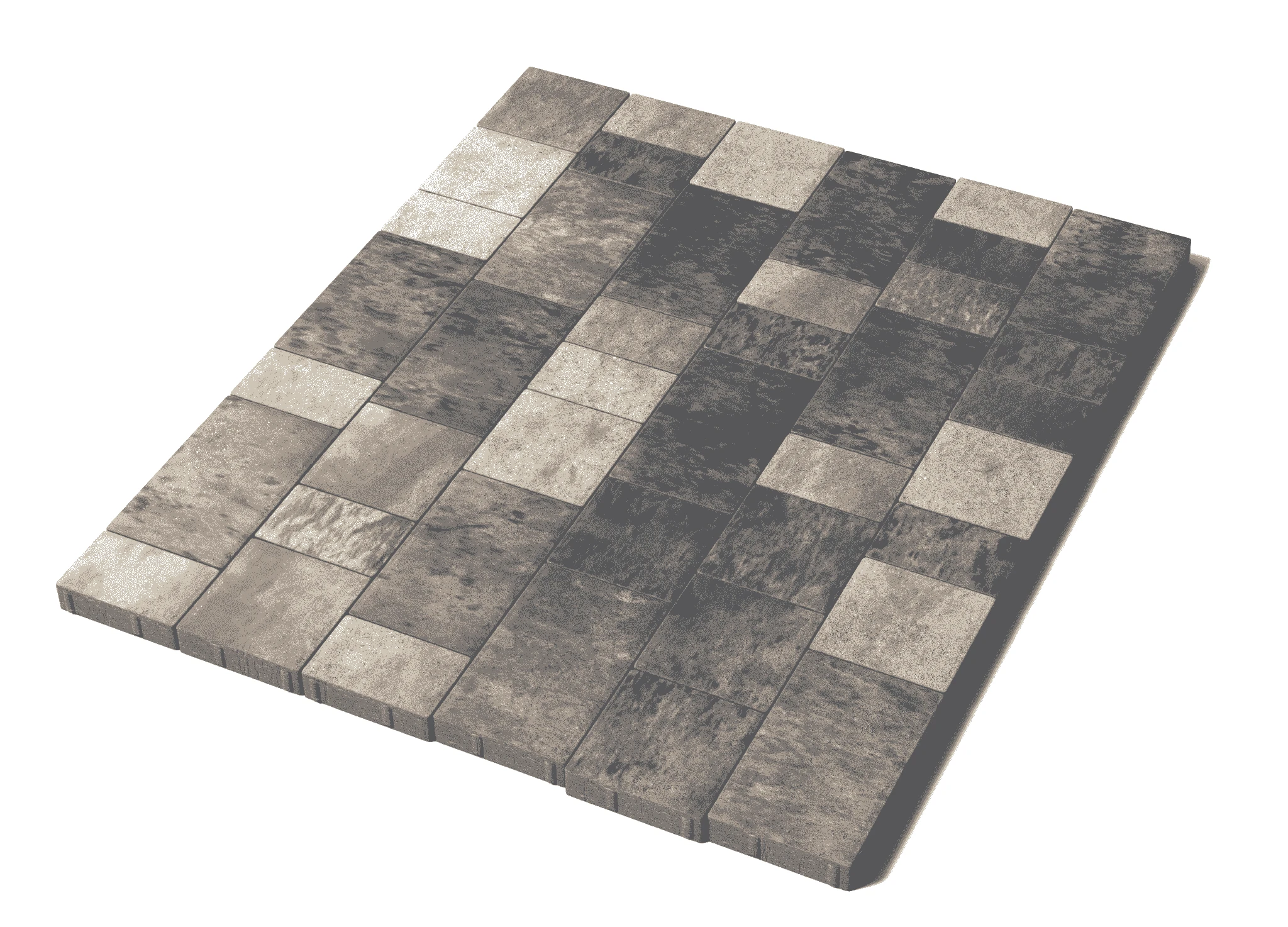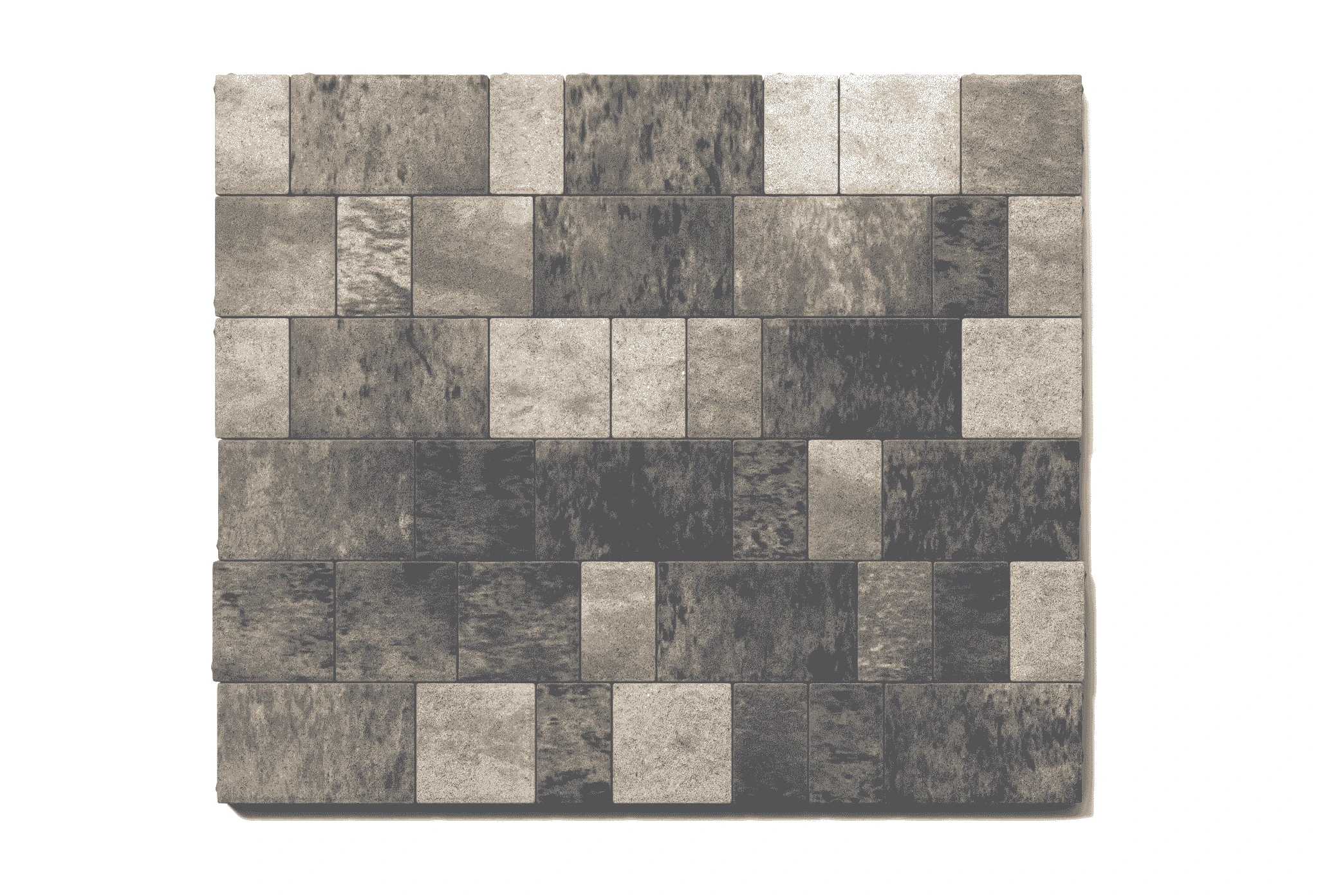 Состоит из 3-х элементов, которые выкладываются в хаотичном порядке рядами. Изготавливается по уникальной технологии методом полусухого вибропрессования из бетона. Поверхность бело-черно-коричневого цвета.