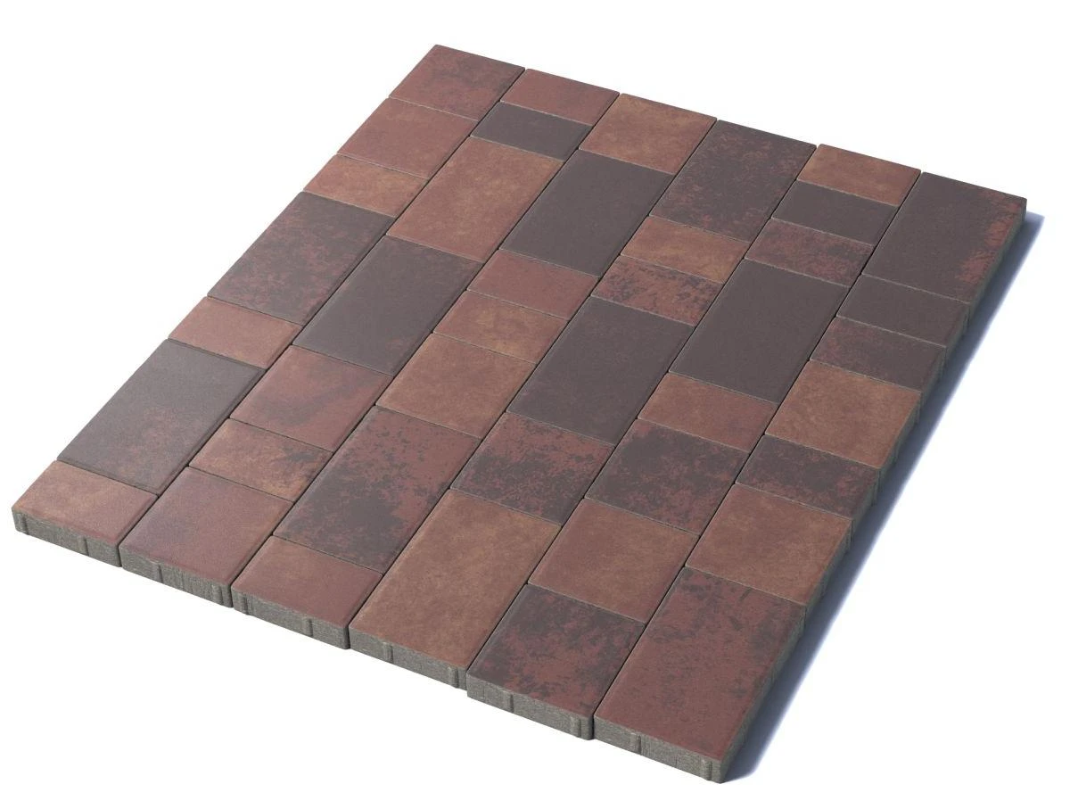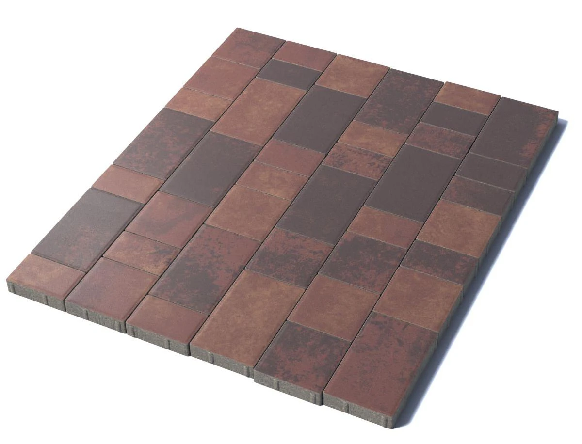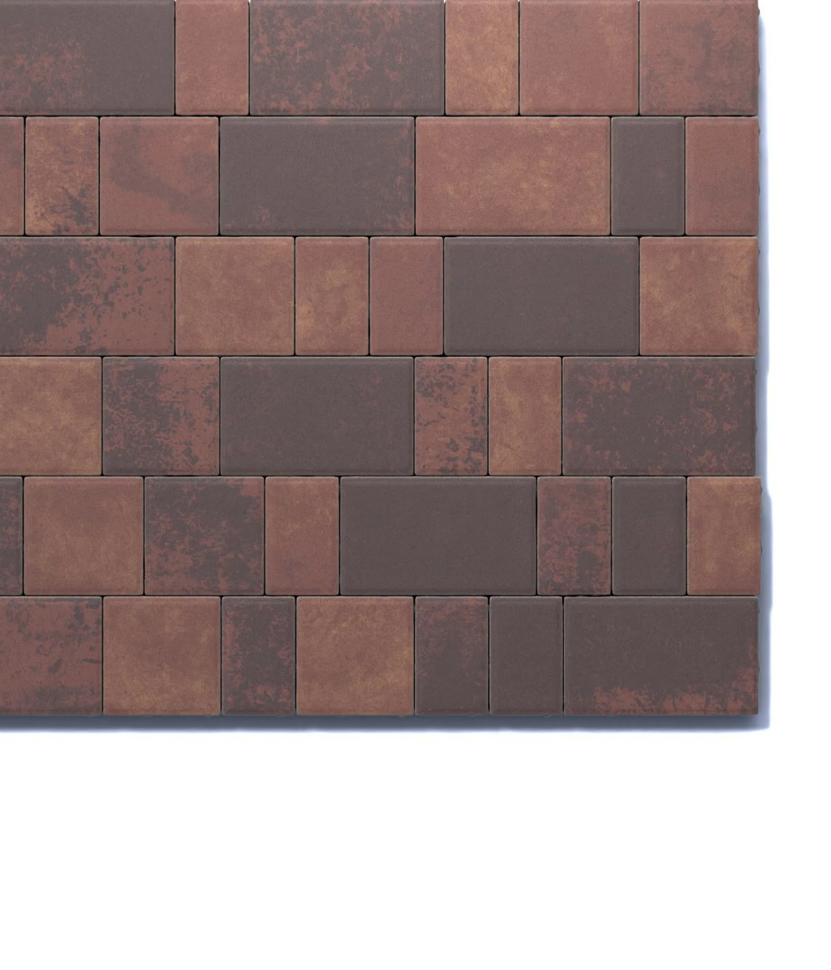 Состоит из 3-х элементов, которые выкладываются в хаотичном порядке рядами. Изготавливается по уникальной технологии методом полусухого вибропрессования из бетона. Поверхность красно-коричнево-оранжевого цвета.