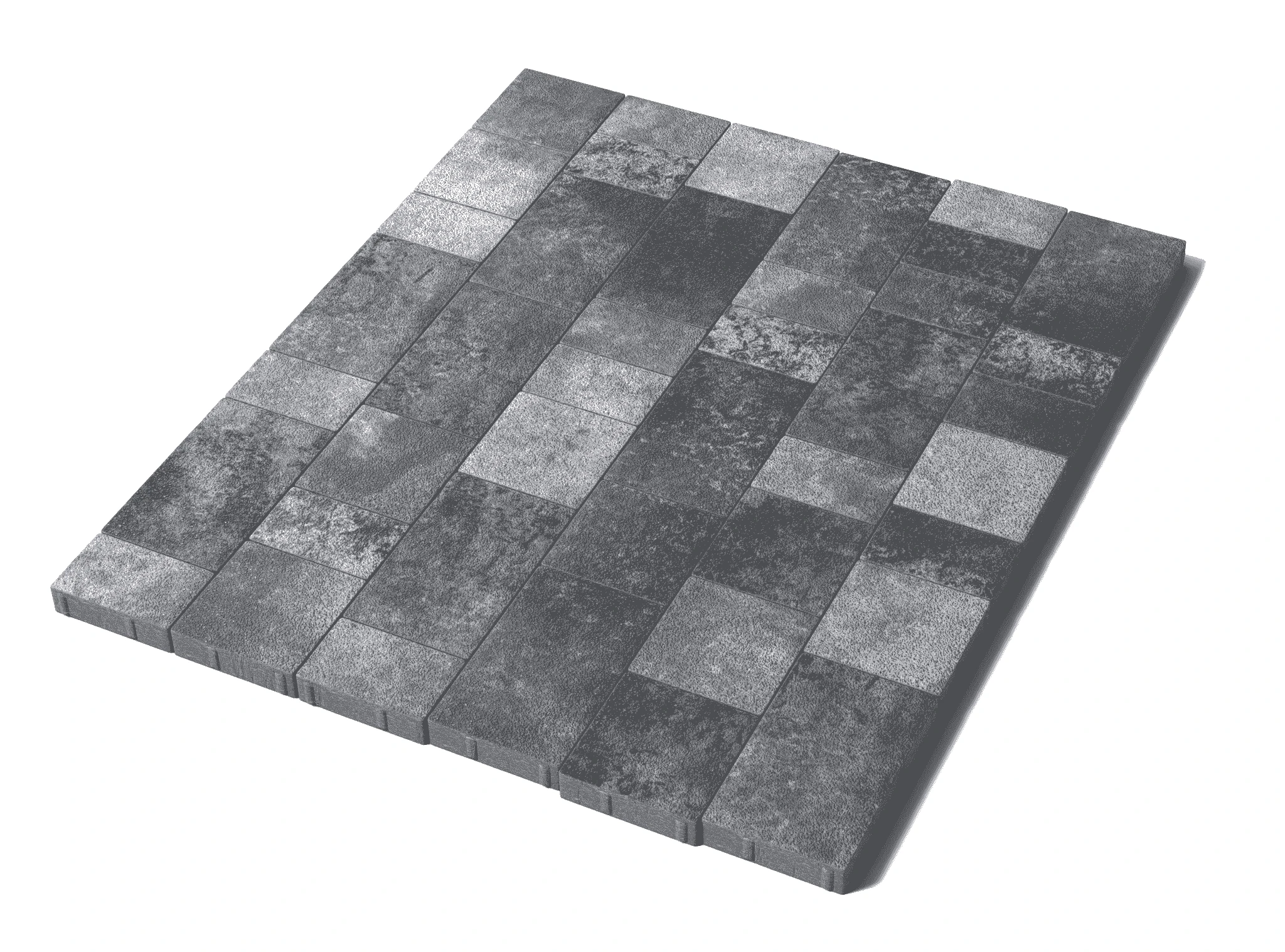Состоит из 3-х элементов, которые выкладываются в хаотичном порядке рядами. Изготавливается по уникальной технологии методом полусухого вибропрессования из бетона. Поверхность выполнена с оригинальной зернистой фактурой черно-белого цвета. Натуральная гранитная крошка в лицевом слое изделий наделяет плитку приятной шероховатостью, а также устойчивостью к скольжению.
