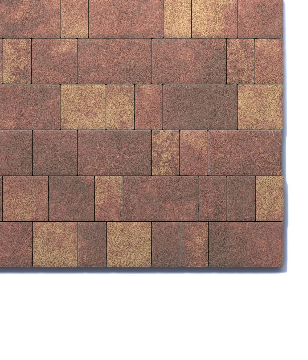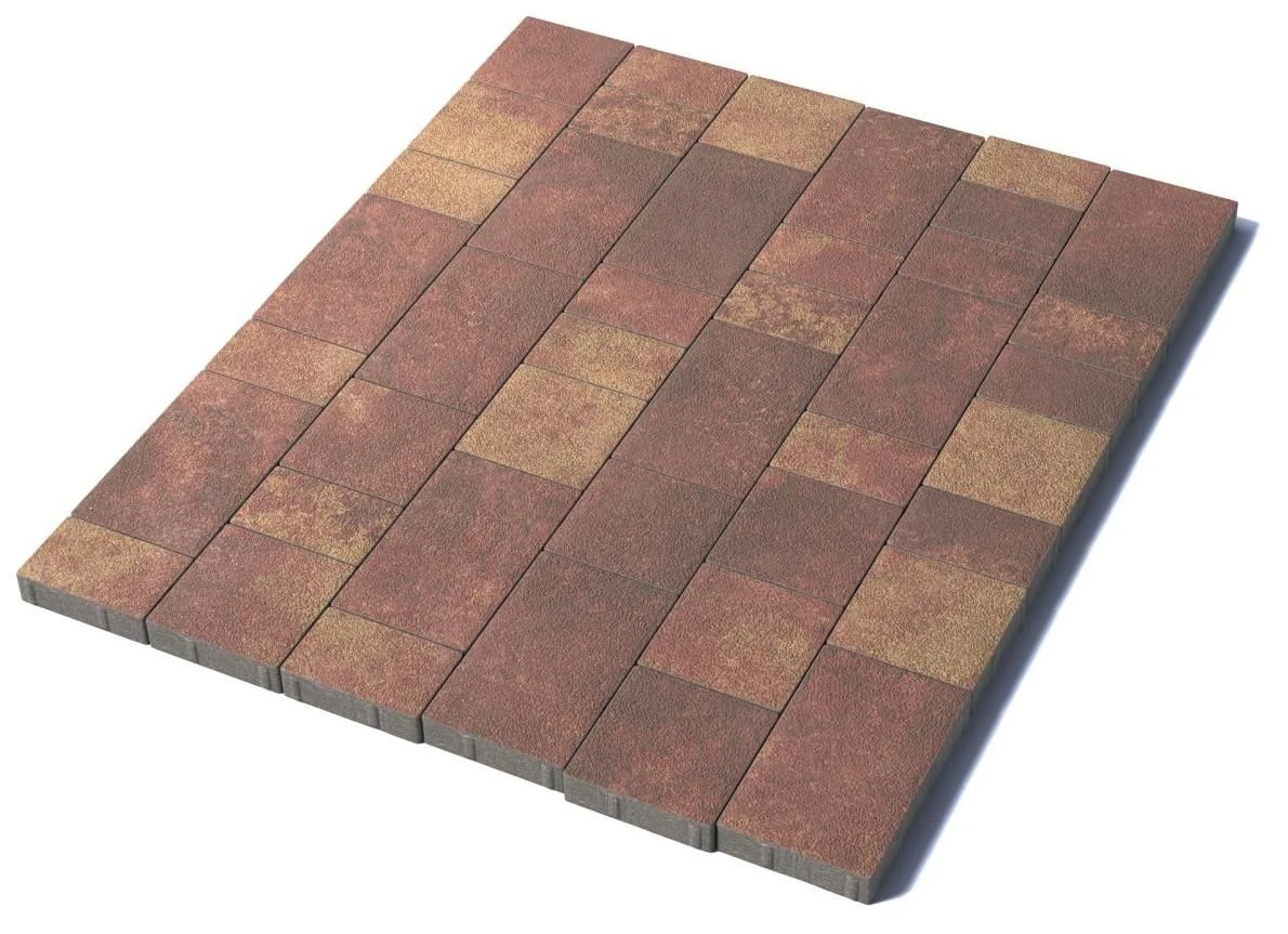 Состоит из 3-х элементов, которые выкладываются в хаотичном порядке рядами. Изготавливается по уникальной технологии методом полусухого вибропрессования из бетона. Поверхность выполнена с оригинальной зернистой фактурой красно-коричнево-желтого цвета. Натуральная гранитная крошка в лицевом слое изделий наделяет плитку приятной шероховатостью, а также устойчивостью к скольжению.