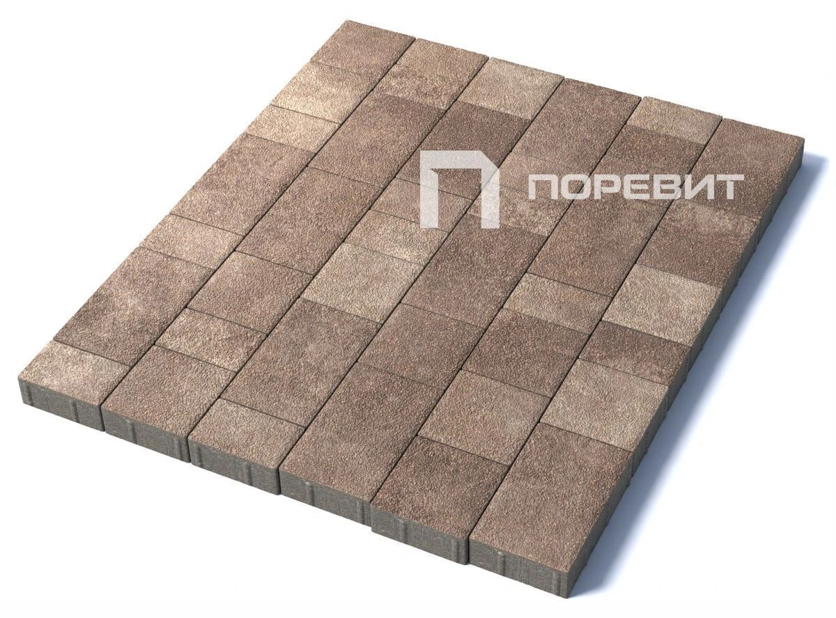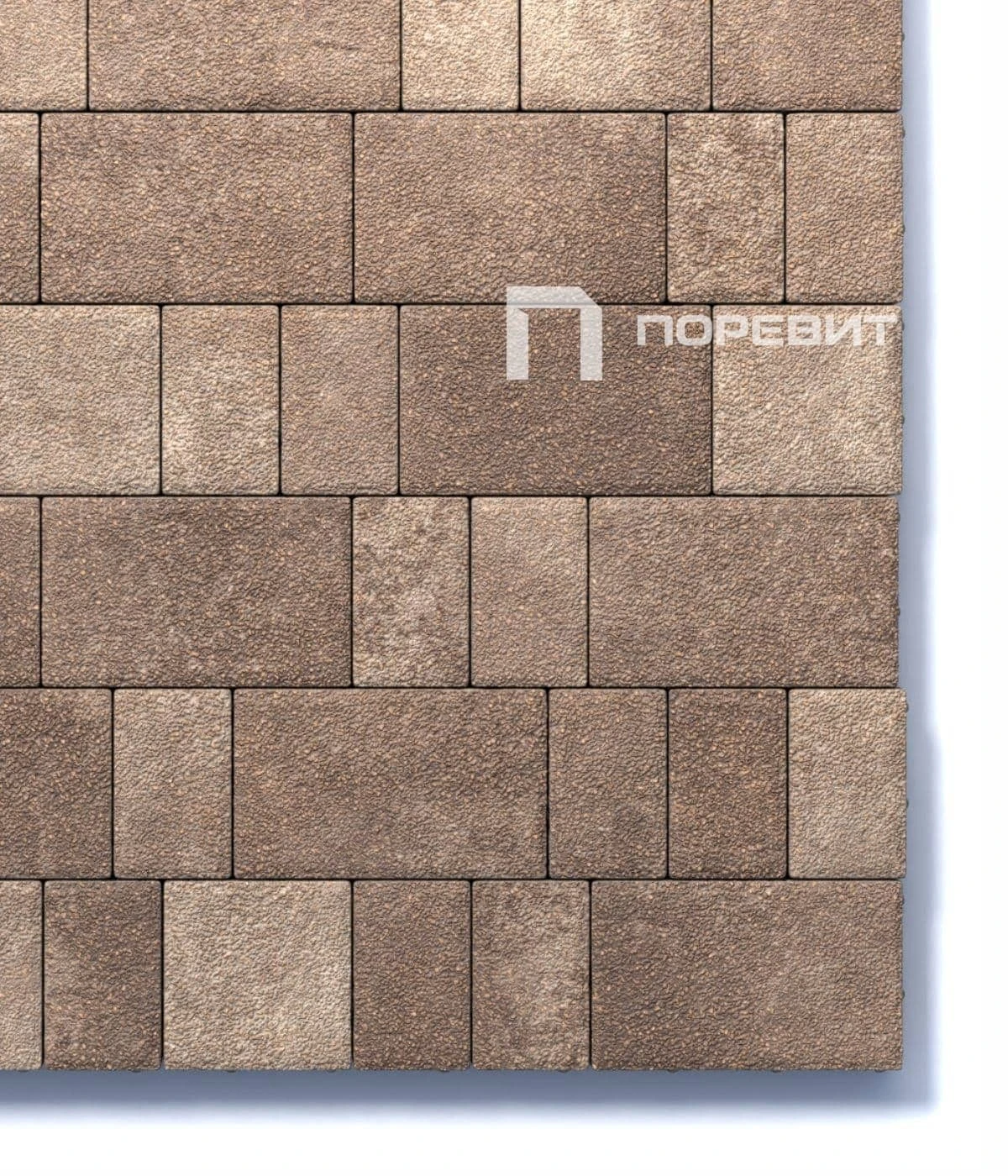 Состоит из 3-х элементов, которые выкладываются в хаотичном порядке рядами. Изготавливается по уникальной технологии методом полусухого вибропрессования из бетона. Поверхность выполнена с оригинальной зернистой фактурой бело-бежево-коричневого цвета. Натуральная гранитная крошка в лицевом слое изделий наделяет плитку приятной шероховатостью, а также устойчивостью к скольжению. Для прокраса плиты в нескольких цветах применяется технология введения пигмента в бетон Colormix. Два или три пигмента, нанесённые хаотично, образуют неповторимый рисунок на поверхности изделия.