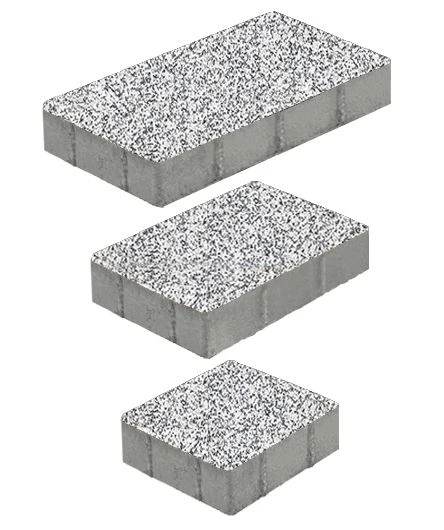Состоит из 3-х элементов, которые выкладываются в хаотичном порядке рядами. Изготавливается по уникальной технологии методом полусухого вибропрессования из бетона. Брусчатка Трио изготовлена с добавлением натуральной мраморной крошки бело-чёрного цвета, отличается высокими физико-механическими свойствами.