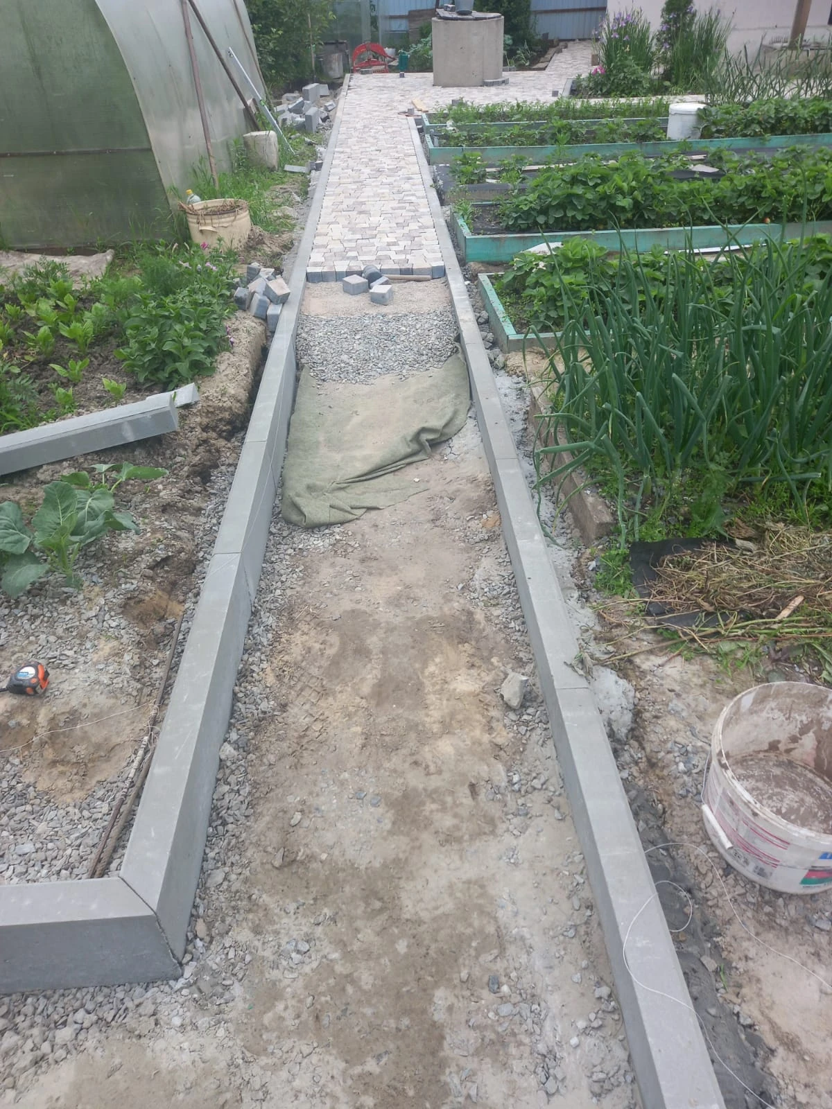 - Нанесение и разравнивание слоя песка.
