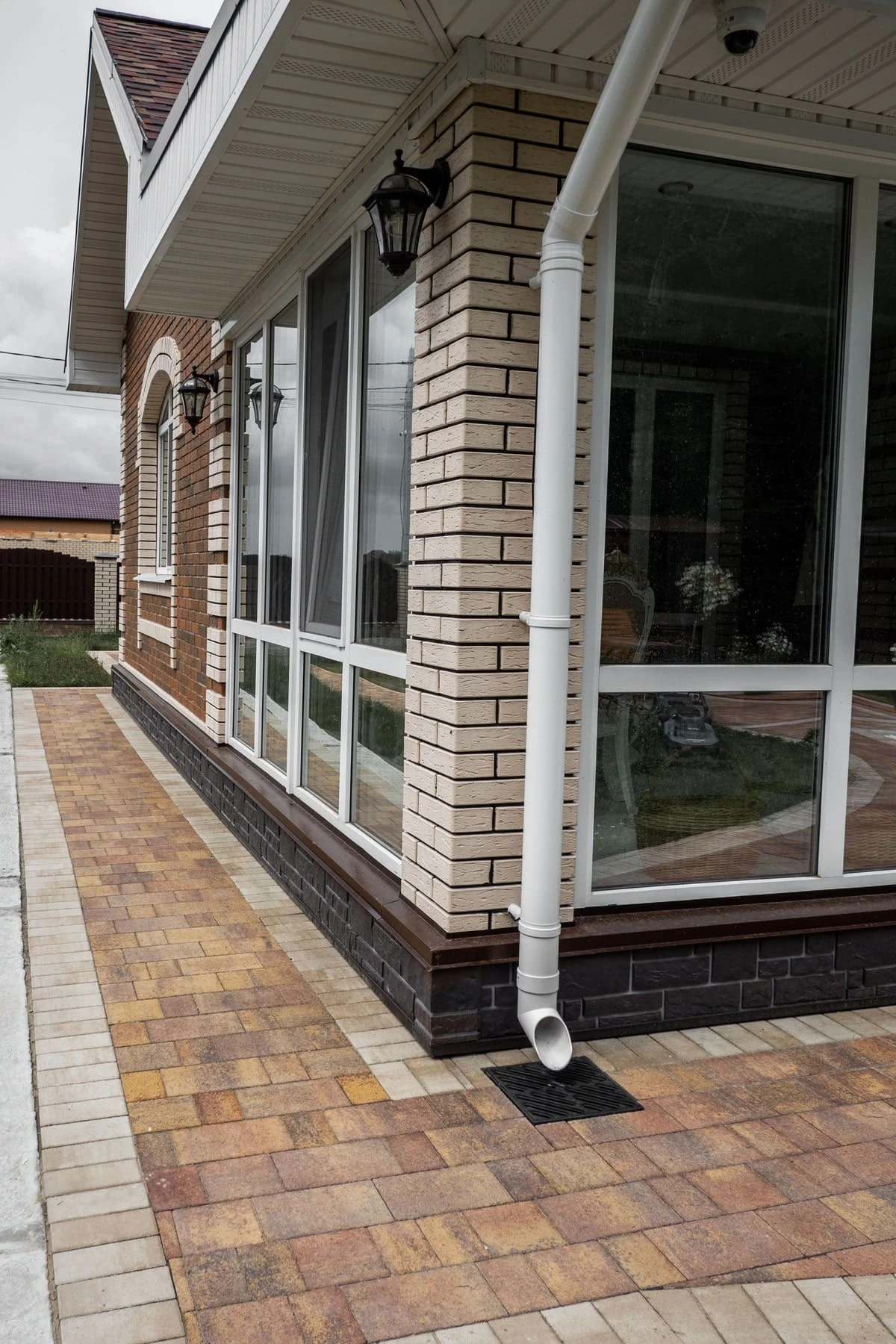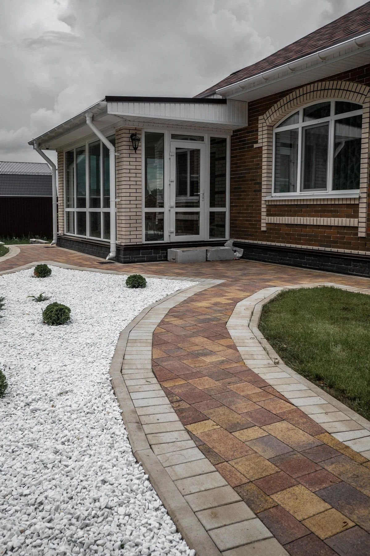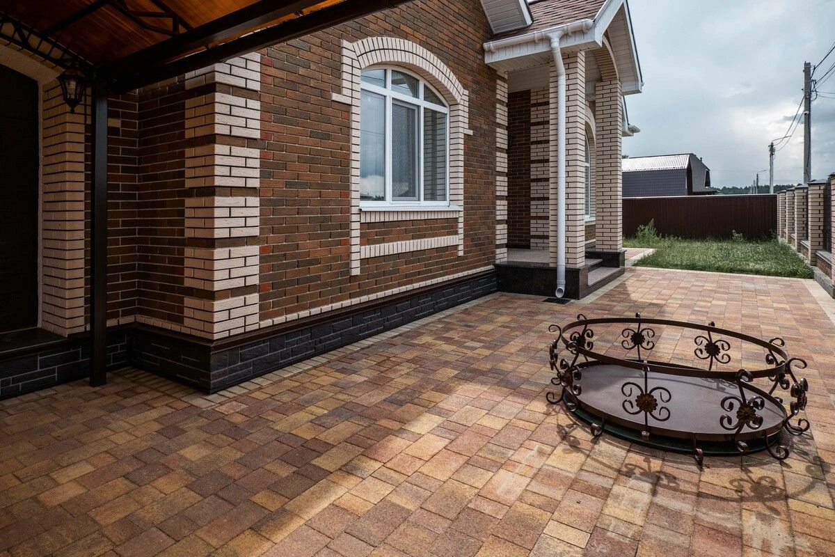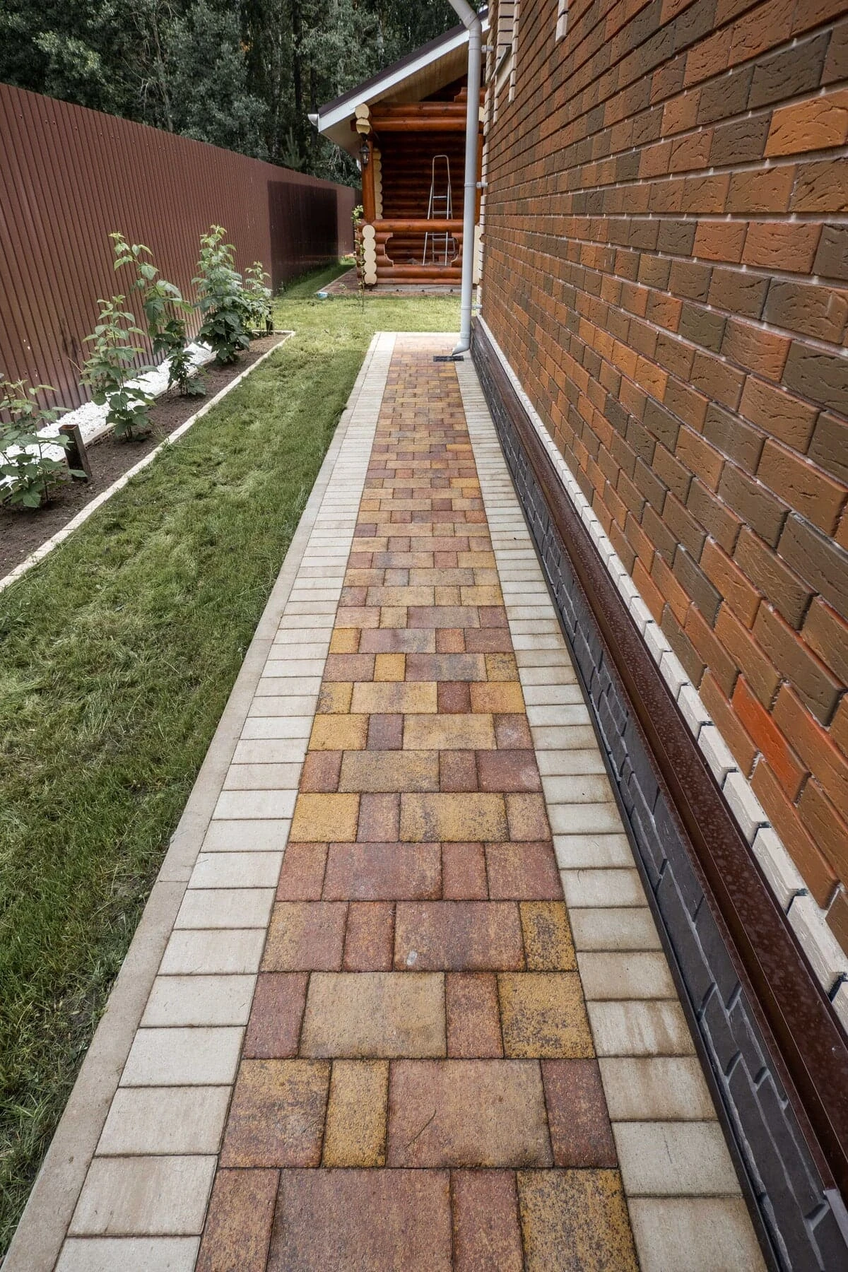 Мощение выполнено двумя тротуарными плитками от завода «Поревит»: «Старый город» в цвете Осень и «Прямоугольник» в цвете Степняк. Для оформления бордюров цвет «Степняк». Все товары представлены ниже и доступны для покупки.