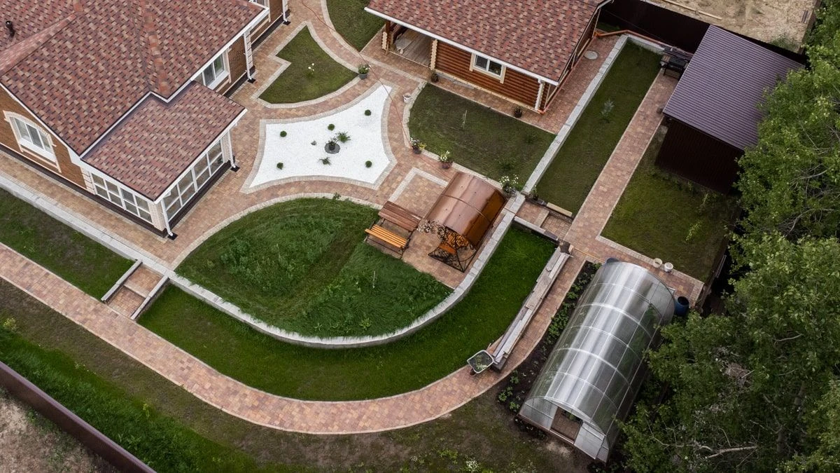 Классическое стилевое решение с сочетающимися между собой блоками позволило благоустроить территорию вокруг дома таким образом, чтобы не оттенять его дизайн, а дополнять архитектурные решения.