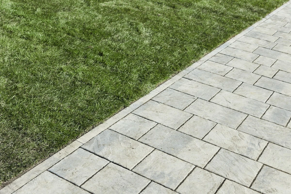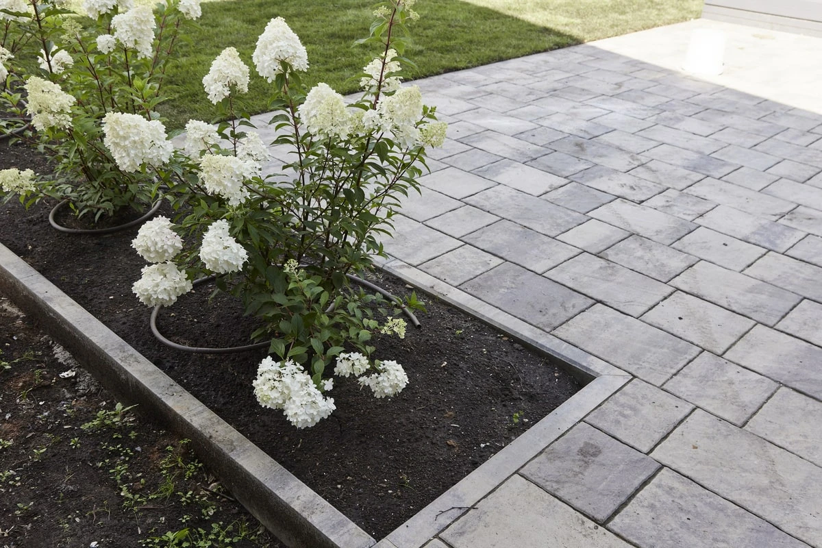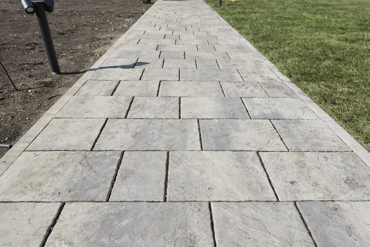 Для этих работ идеально подошли тротуарная плитка Литос в цвете Шунгит, а также бордюры в этом же цвете. Дорожки выполнены в строгом геометрическом формате с прямыми углами, ширина выбрана таким образом, чтобы как минимум два человека могли с легкостью идти рядом или разойтись на дорожке.