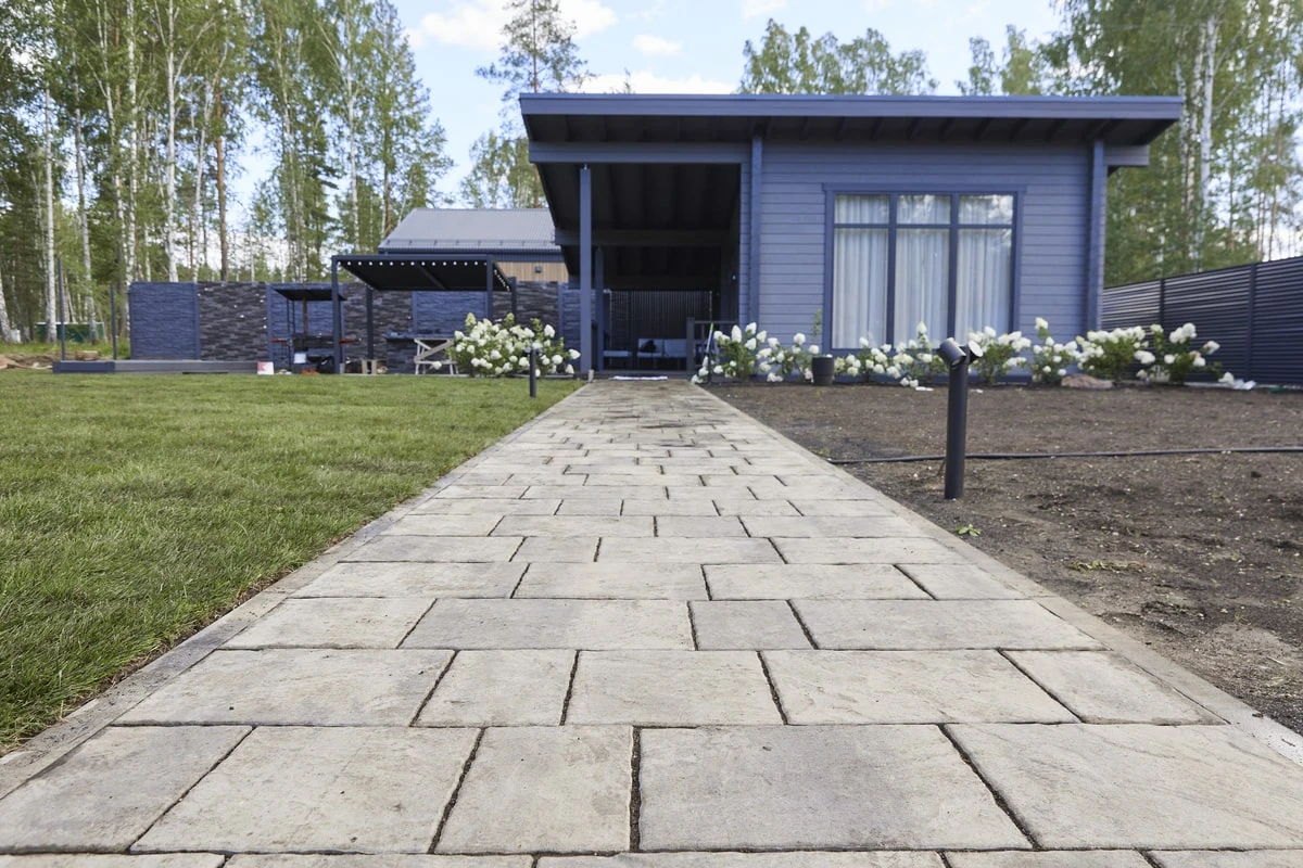 Данный проект выполнен для частного дома в коттеджном поселке Заповедник в Свердловской области. Задача заключалась в том, чтобы выполнить ровные геометрические дорожки по территории дома, которые будет сочетаться с общим дизайном дома и не сильно выделяться яркими цветами в общем стиле.