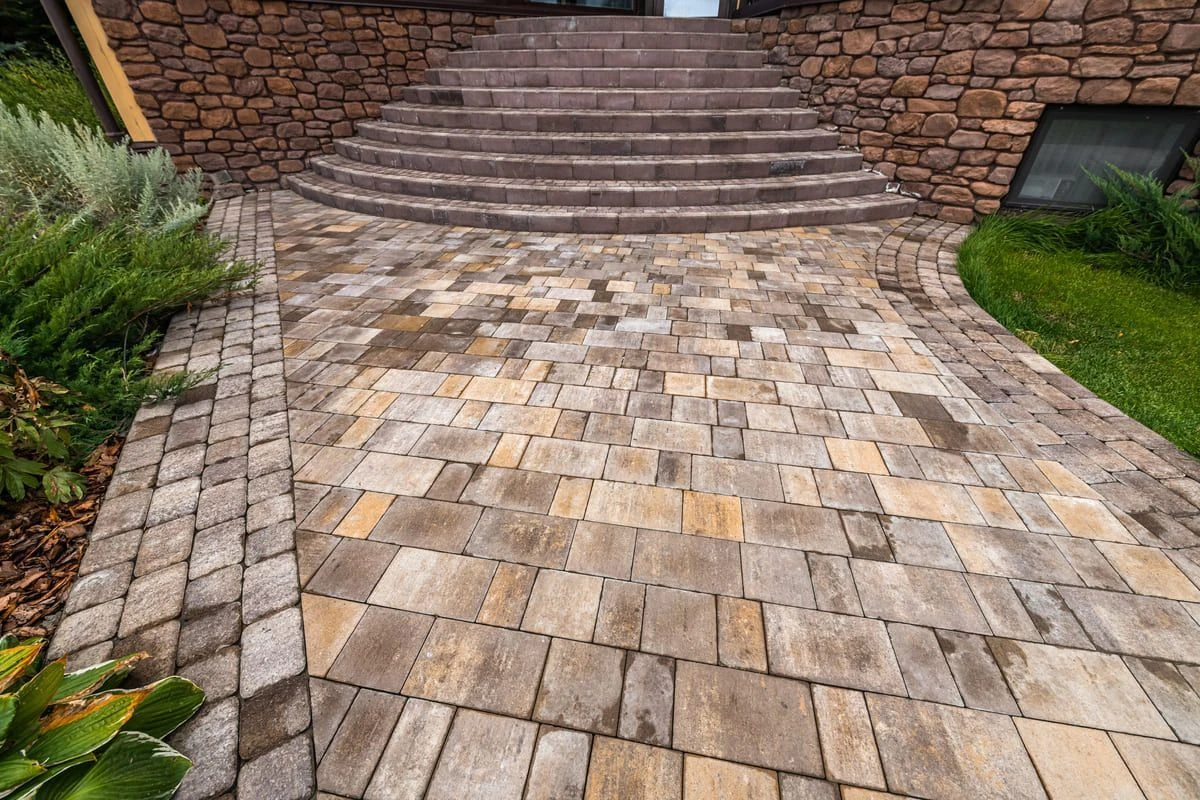 Коричневая гамма цветов сочетается друг с другом, образуя единое покрытие. Плиткой также вымощено крыльцо, входные группы, отмостка дома и клумбы.