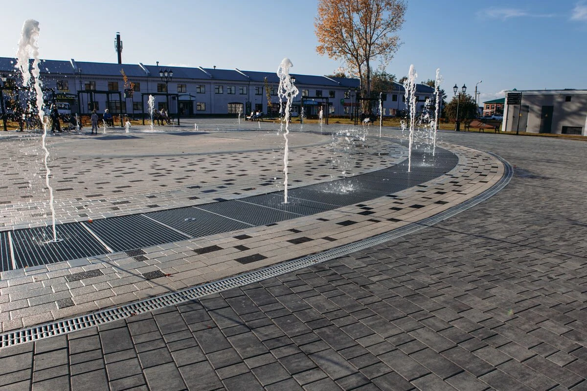 2. Благоустройство тротуарных дорожек: На всех пешеходных дорожках форма Старый город и Абрис. А в зоне фонтана плита Старый город, в фактуре Мрамор, белого и черного цвета.