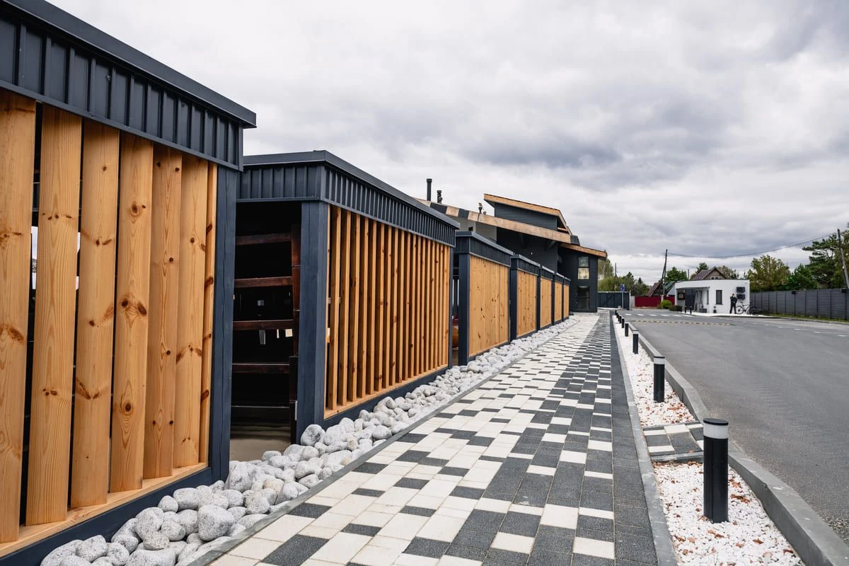 Благоустройство базы отдыха Липовое выполнено с применением плитки «Поревит». Основой тротуарного мощения стала плитка Старый город в коллекции Мрамор белого и черного цвета. Фактура плитки придает ей премиальность, блеск на солнце.