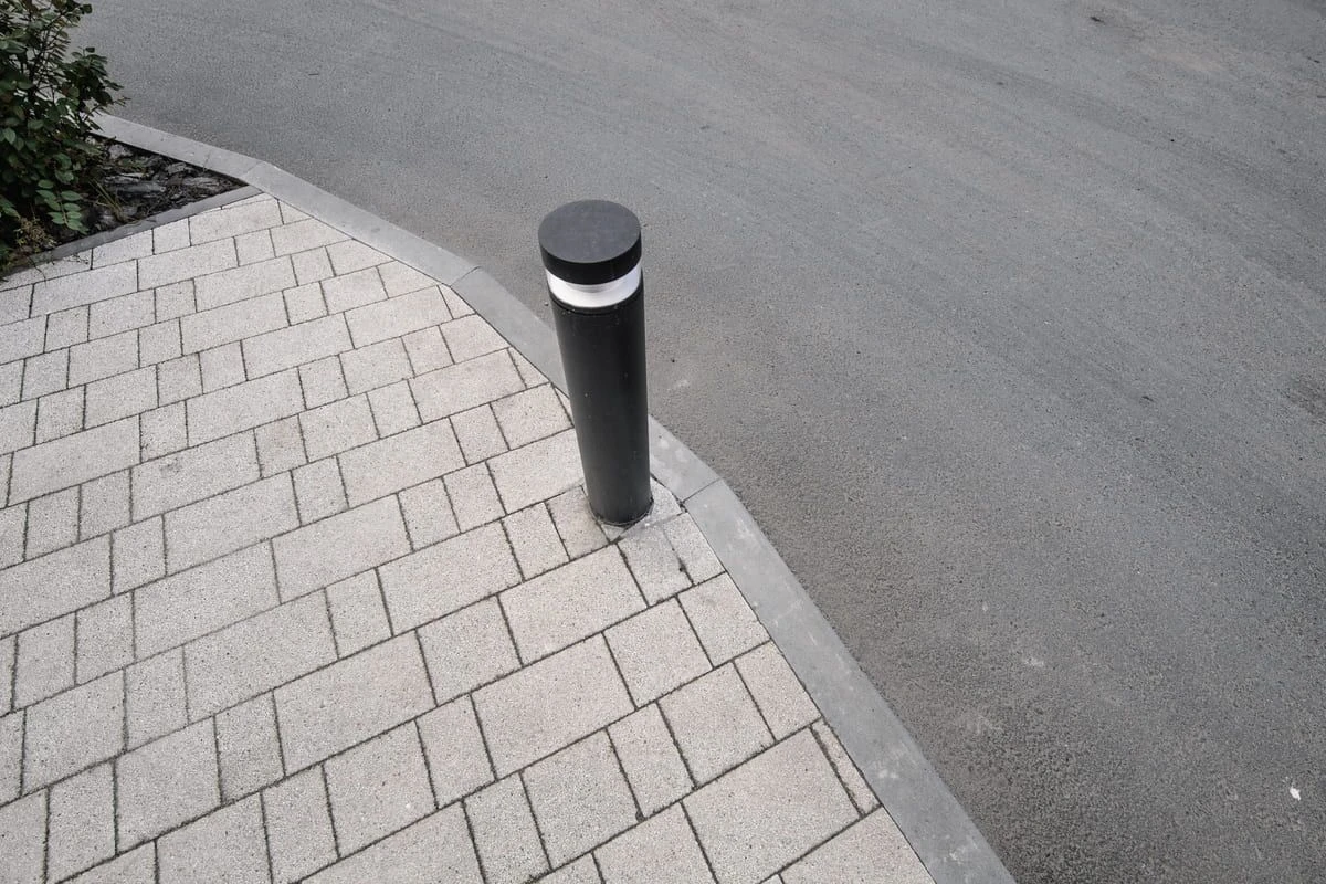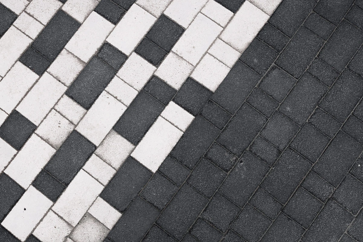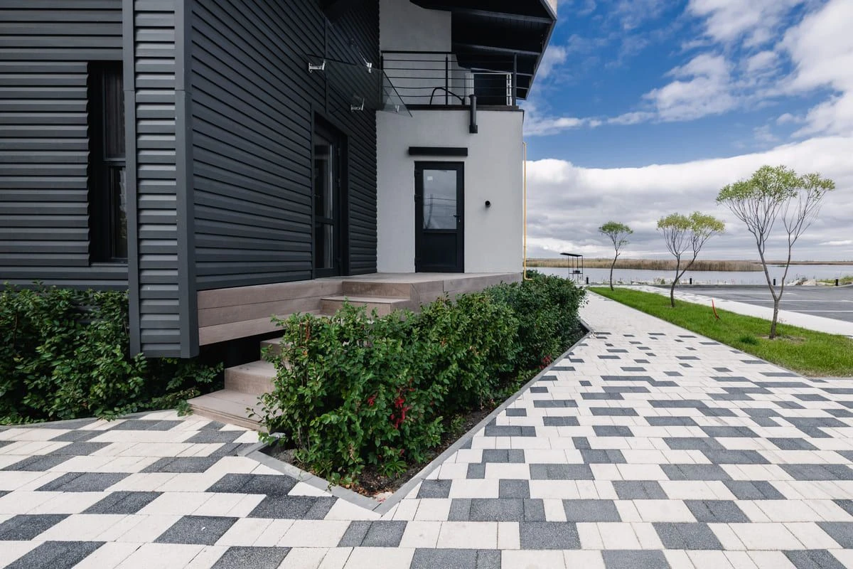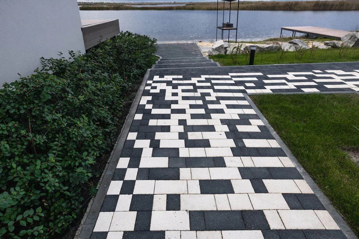Основной рисунок выстроен с помощью хаотичной разбивки черного и белого цвета, но в местах ближе к дороге или дому плитка переходит в один цвет — черный или белый. Это визуально отделяет прогулочную зону от всех остальных, при этом подобранные цвета гармонируют с постройкой.