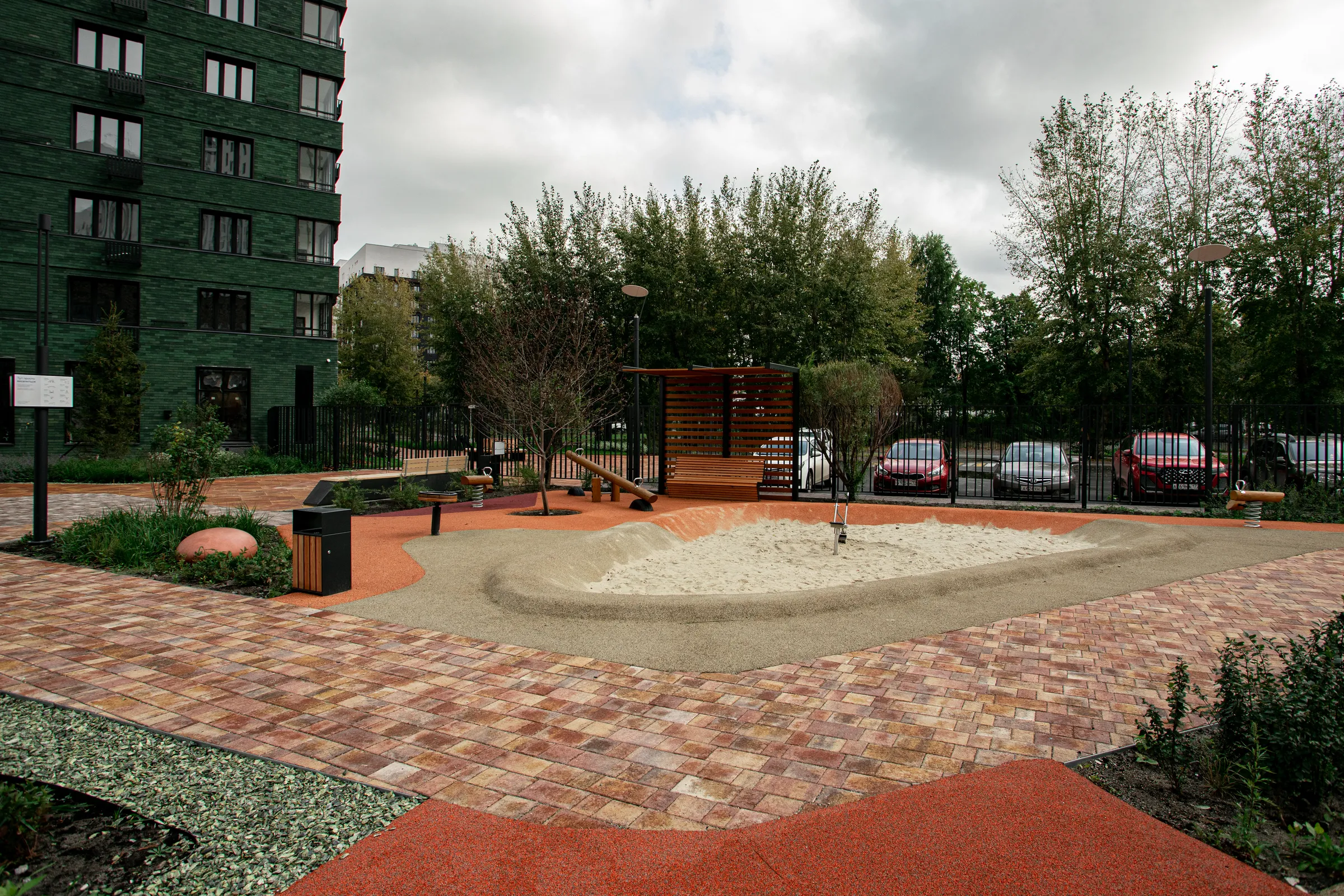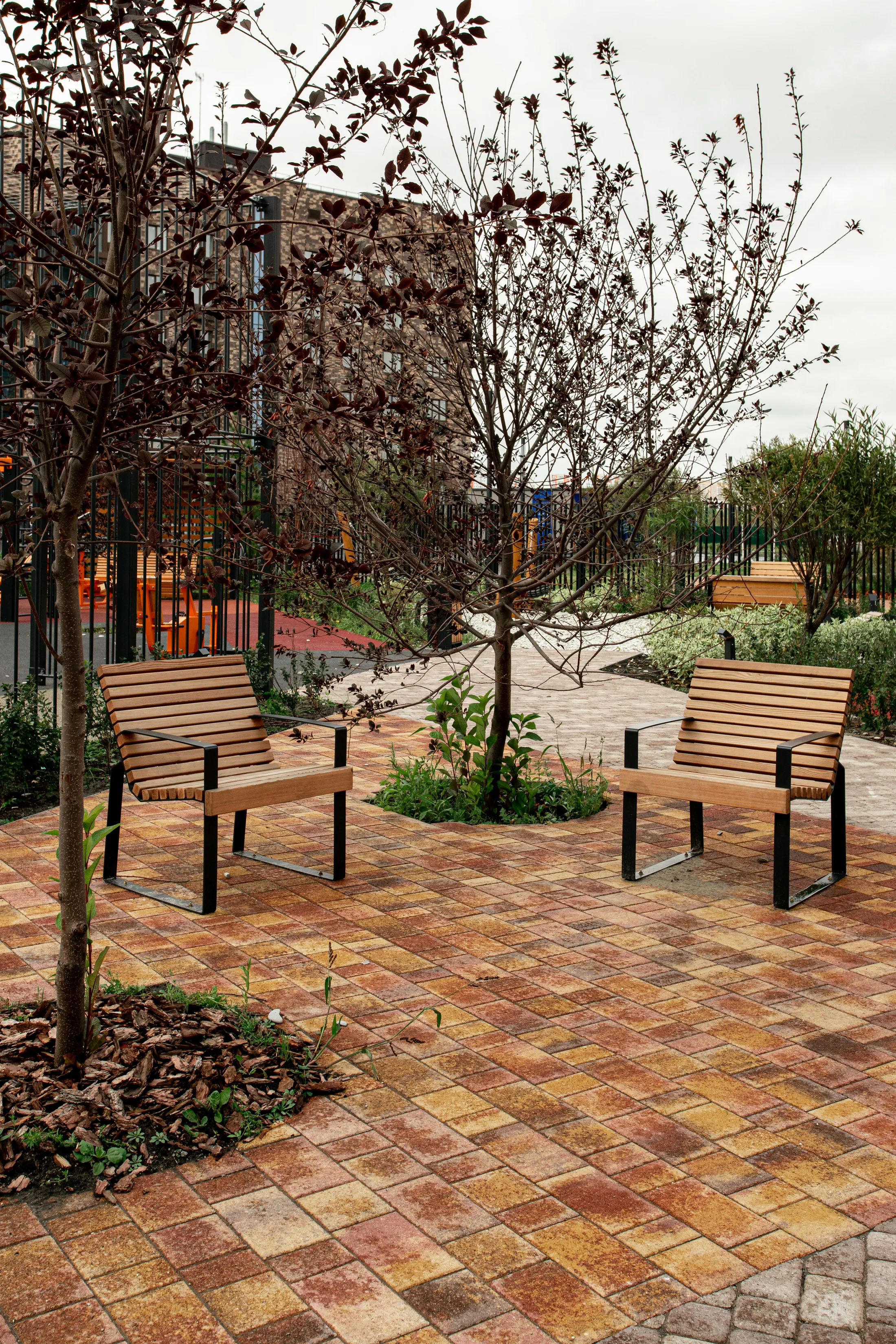Территория жилого комплекса "О Два" в Тюмени благоустроена с применением твердых покрытий из тротуарной плитки в толщине 60 и 80 мм.