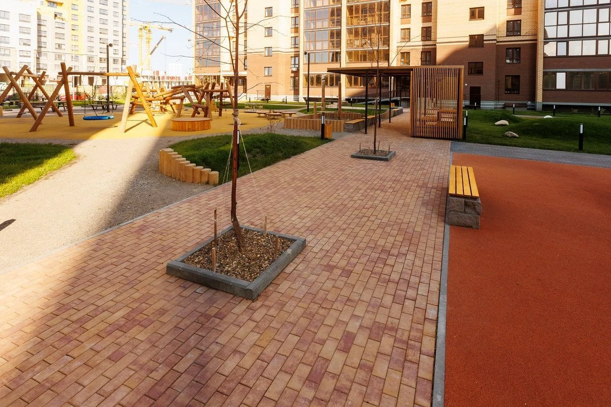 Для оформления дорожно-тропиночной сети была использована тротуарная плитка: